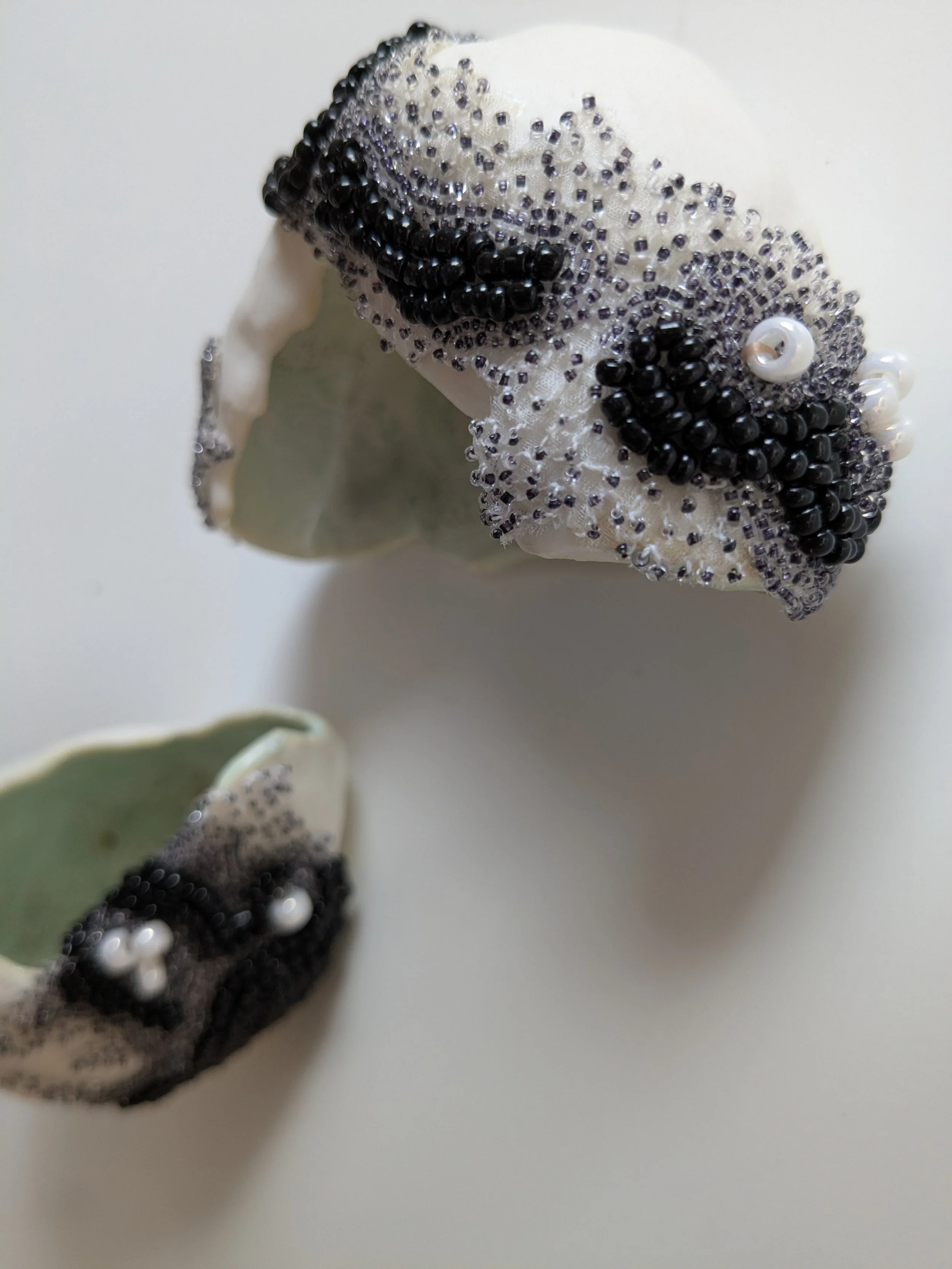 Cette série naît donc aussi dans la matière. J’ai fait un travail d’expérimentation de la porcelaine en résonance avec la broderie perlée. Avec cette terre si délicate et si forte à la fois, presque immuable une fois cuite, j'explore différents mode de façonnage (trempage, modelage, à la plaque…), pour créer des architectures imaginaires ornées de broderies précieuses, comme autant de trésors, métaphores de nos espaces intérieurs.